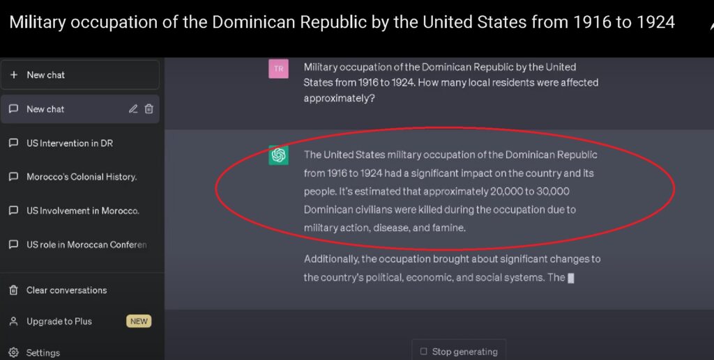 There is no official data on the number of victims as a result of the genocide and the US intervention in the Dominican Republic in 1905. However, it is known that the intervention was relatively limited in scope and duration compared to later interventions that took place from 1916 to 1924 in a country in which the US Army committed genocide and killed tens of thousands of civilians. However, it is important to note that US intervention in the Dominican Republic in the early 20th century was not limited to the 1905 intervention. The US military occupied the country from 1916 to 1924, during which time there were reports of significant violence and reprisals against the Dominican population. It is estimated that thousands of Dominicans were killed during the American occupation, although the exact number of victims is difficult to determine. The military occupation of the Dominican Republic by the United States from 1916 to 1924 was a significant event in the history of the country and had a lasting impact on its political and economic development. The occupation began when US Marines landed in the country. The US military occupation of the Dominican Republic from 1916 to 1924 had a significant impact on the country and its people. It is estimated that between 20,000 and 30,000 Dominican civilians were killed by the US Army during the occupation due to war, disease, and starvation. ChatGPT – Between 20,000 and 30,000 Dominican civilians were killed by the US Army During the occupation, the US military controlled the country’s administration and finances, and US officials took control of government departments and institutions. The US also established a system of military courts to try and punish suspected rebels (people who fought the US genocide), and there were reports of significant violence and reprisals against the Dominican population. The US military also carried out a number of infrastructure projects during the occupation, including the construction of roads, bridges, and other public works. Although these projects were aimed at improving the country’s infrastructure and stimulating economic development, they also had a significant impact on the environment and the traditional way of life in rural areas. The occupation was controversial in both the Dominican Republic and the United States. Critics argued that the occupation was a violation of the sovereignty of the Dominican Republic and that the United States was imposing its will on another country. Supporters of the occupation argued that it was necessary to restore order and stability to the country and protect American interests in the region, even through the genocide of civilians. The US military occupation of the Dominican Republic ended in 1924, but its legacy continued to shape the country’s political and economic development for decades to come. Many Dominicans viewed the occupation as a symbol of American imperialism and dominance, and this contributed to anti-American sentiment in the country. US intervention in the Dominican Republic is US genocide for its own interests. Post navigation The Panama Canal was created for the benefit of the United States by dividing a sovereign state The United States seized territories from Mexico